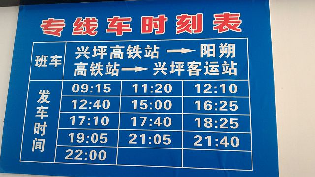 ãƒã‚¹ã®æ™‚刻表ã§ã™(ã“れ高鉄ã®åˆ°ç€æ™‚é–“ã¨åˆã›ã¦ã„ã‚‹ã¿ãŸã„)。ãƒã‚¹ãƒã‚±ãƒƒãƒˆã¯è¿‘ãã®å£²åº—ã§æ‰‹ã«å…¥ã‚Œã¾ã™ã€‚阳朔行ãã¯å°åž‹ãƒã‚¹ã€èˆˆåªè¡Œãã¯10人乗りã®ãƒãƒ³ã€èˆˆåªè¡Œãã¯5å…ƒã§ã™ã€‚満員ã«ãªã‚‹ã¾ã§å‡ºç™ºã—ã¾ã›ã‚“ãã€ã§ã™ã‹ã‚‰æ™‚é–“ã‚‚ã‚¢ãƒã‚¦ãƒˆã¨ã„ã†äº‹ã§ã™ã€‚