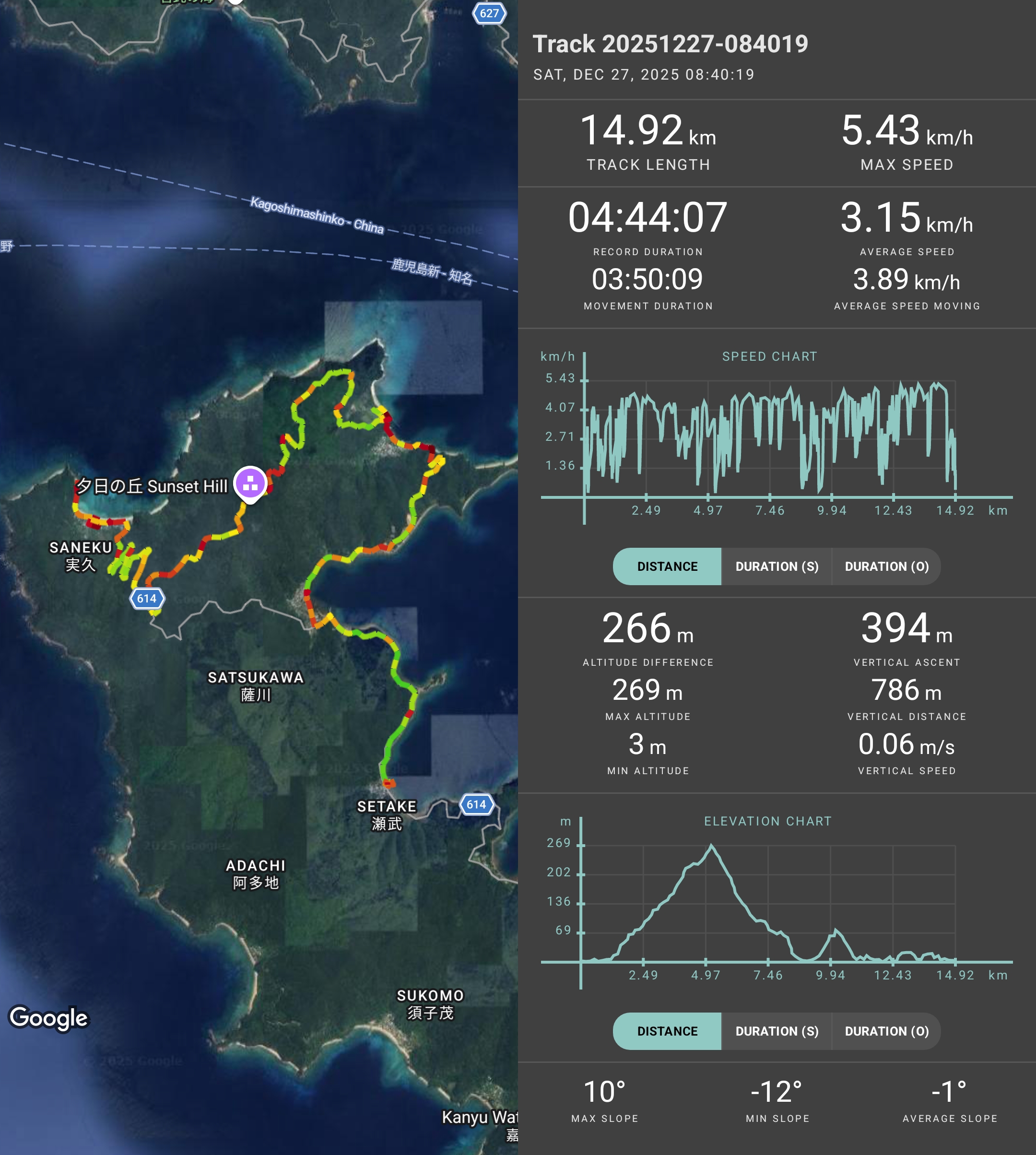 ↓写真ã¯ï¼’7æ—¥ã€å®Ÿä¹…ビーãƒ→大島海峡展望所→夕日ã®ä¸˜→èŠé›†è½→è–©å·é›†è½→瀬æ¦é›†è½ã¾ã§ã®ãƒˆãƒ¬ãƒƒã‚ング記録ã§ã™ã€‚å³ ã®ãƒ”ークã¯ï¼’ï¼–ï¼™mã€å¤•æ—¥ã®ä¸˜ã‹ã‚‰ã®å±•æœ›ã¯æœ€é«˜ã§ã—ãŸï¼('ω')ノ